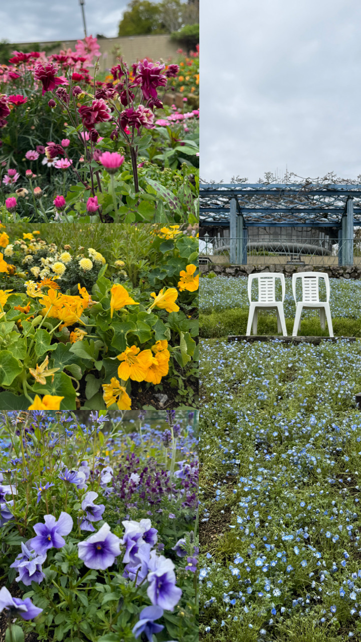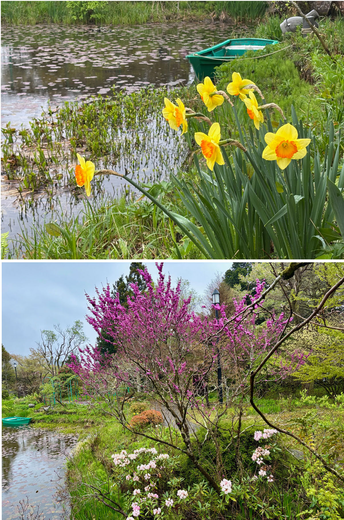 - 藤の丘では 空色のネモフィラやこもれびの庭では真っ赤な 西洋シャクナゲ 、シダレザクラが園内を彩っています。
