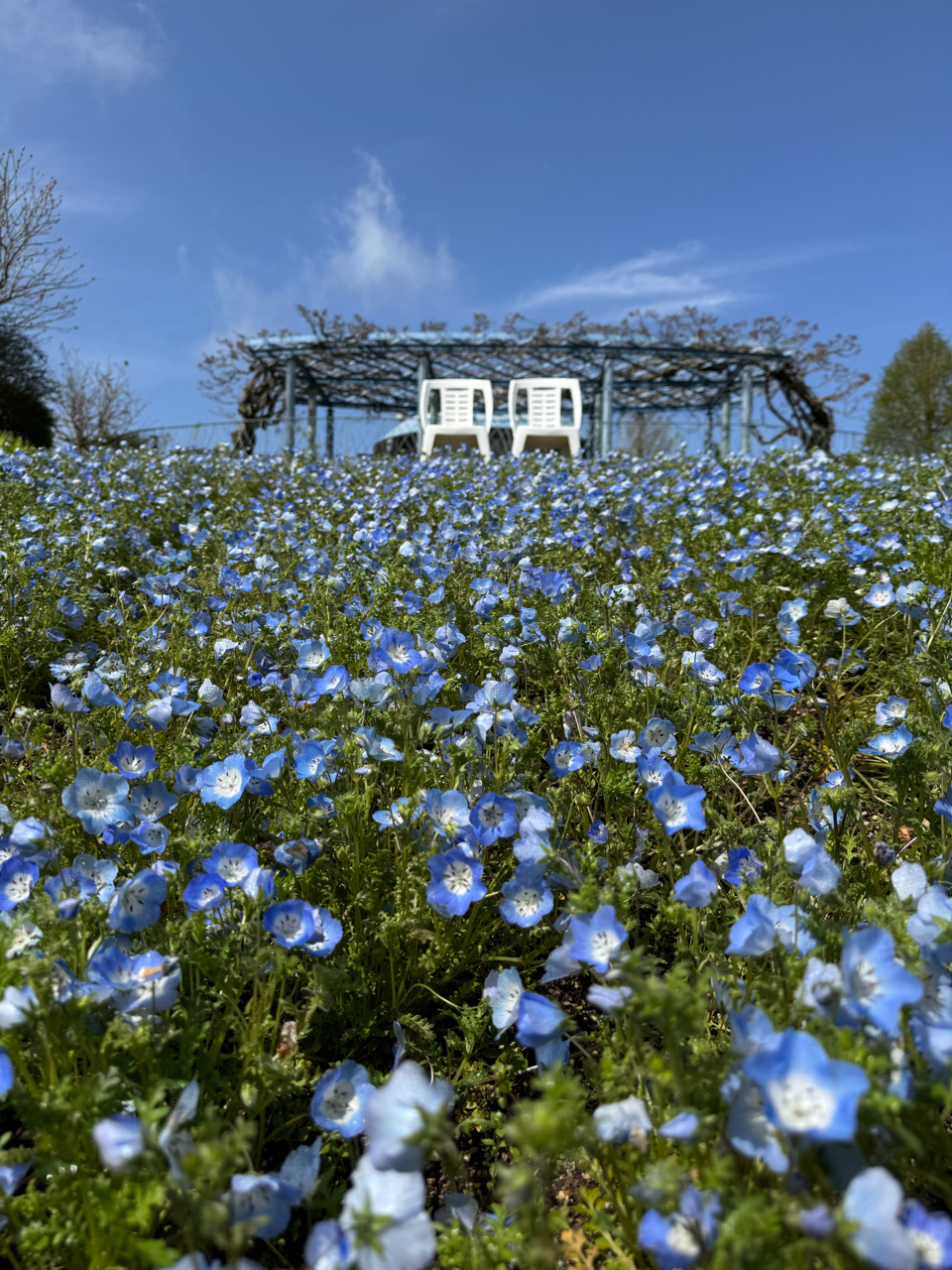 藤の丘では、空色のネモフィラがやわらかに咲き広がり、