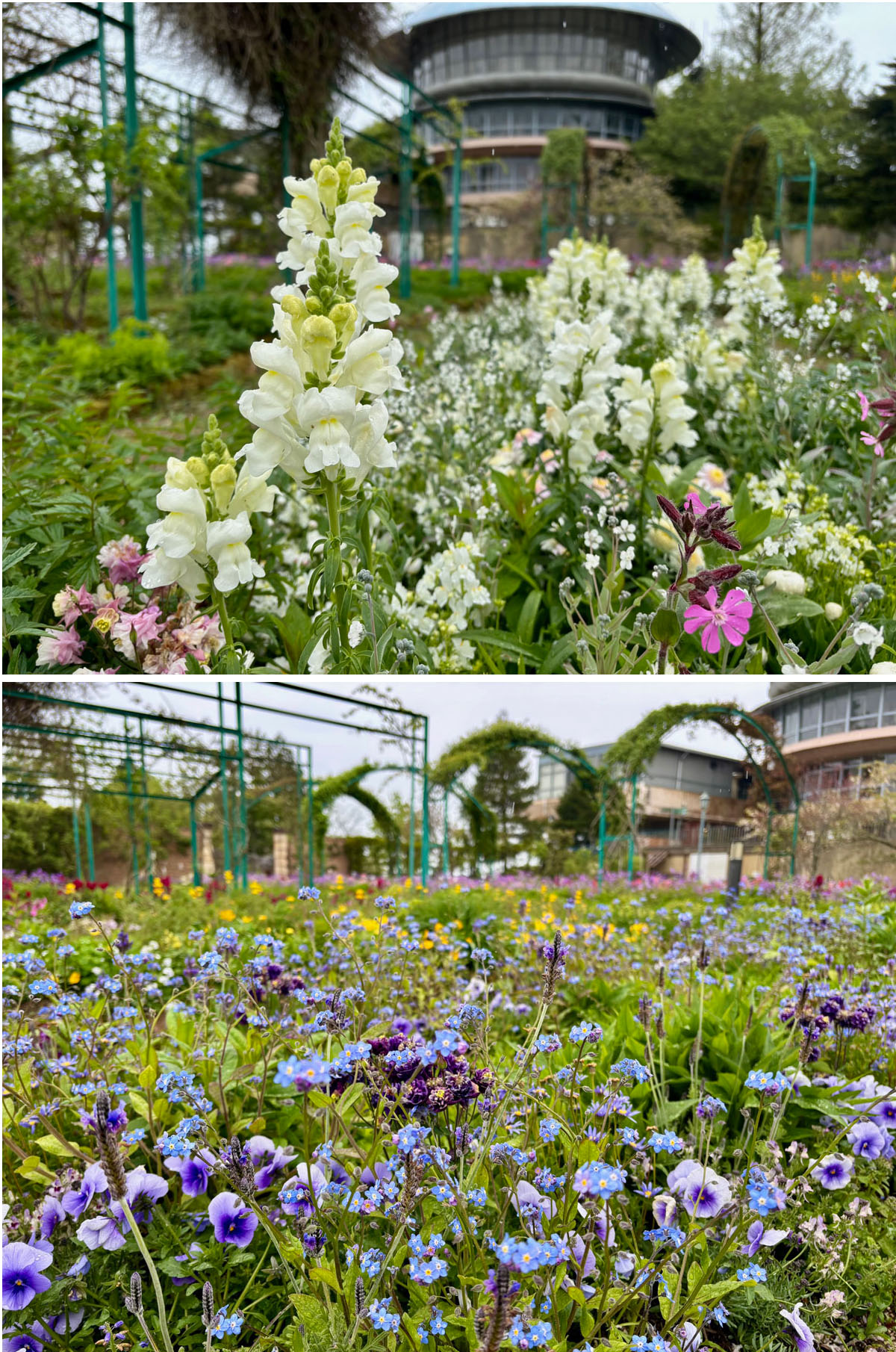 シャクナゲやルピナス 、ナスタチウム、クリサンセマム 、キンギョソウ、ムラサキハナナがなどが色とりどりに開花中。