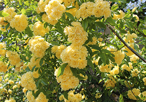 黄色の小輪花が大房で咲く。極早咲き。枝は細くしなやかでとげがない。