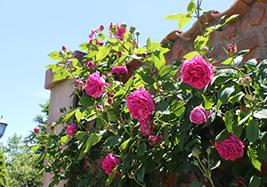 目の覚めるような濃いローズピンクのロゼット咲き。濃厚なダマスク香が満開時には庭中に漂う。 返り咲き、花径10cm,樹高2.0m